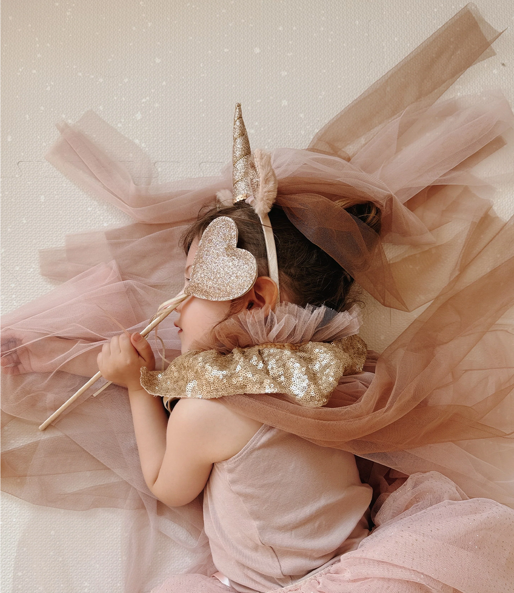 Een beetje liefde, een vleugje glitter en een snufje fantasie! Deze elegante toverstaf van Mrs. Ertha is perfect voor kleine dromers die magie willen verspreiden. Het zachte hartje is bedekt met glanzende gouden glitter en afgewerkt met speelse lintjes in pastelkleuren die sierlijk meebewegen.