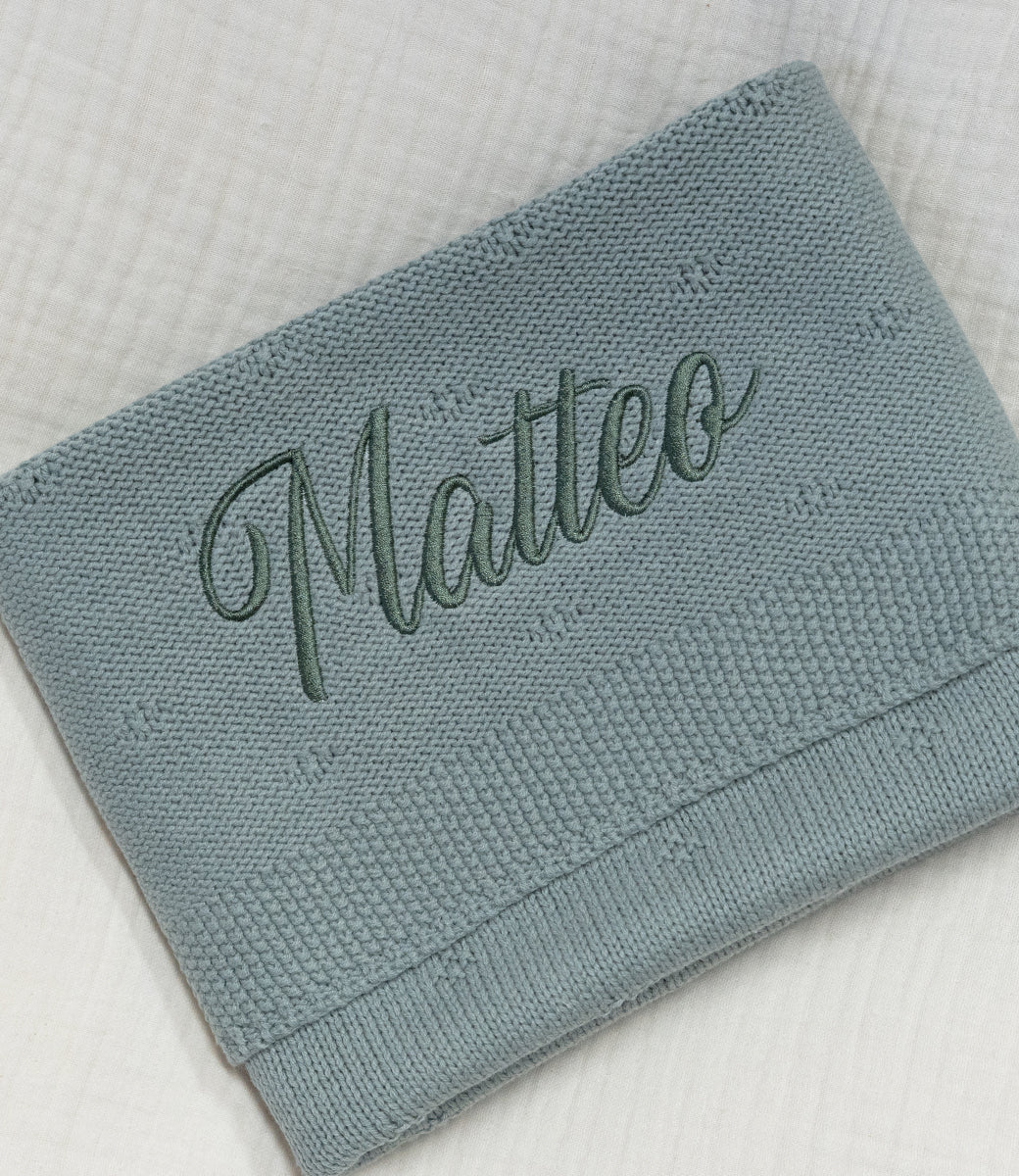 Wil je een borduring in de stijl van je geboortekaartje? Geef je lettertype door en wij werken het dekentje op maat uit.
