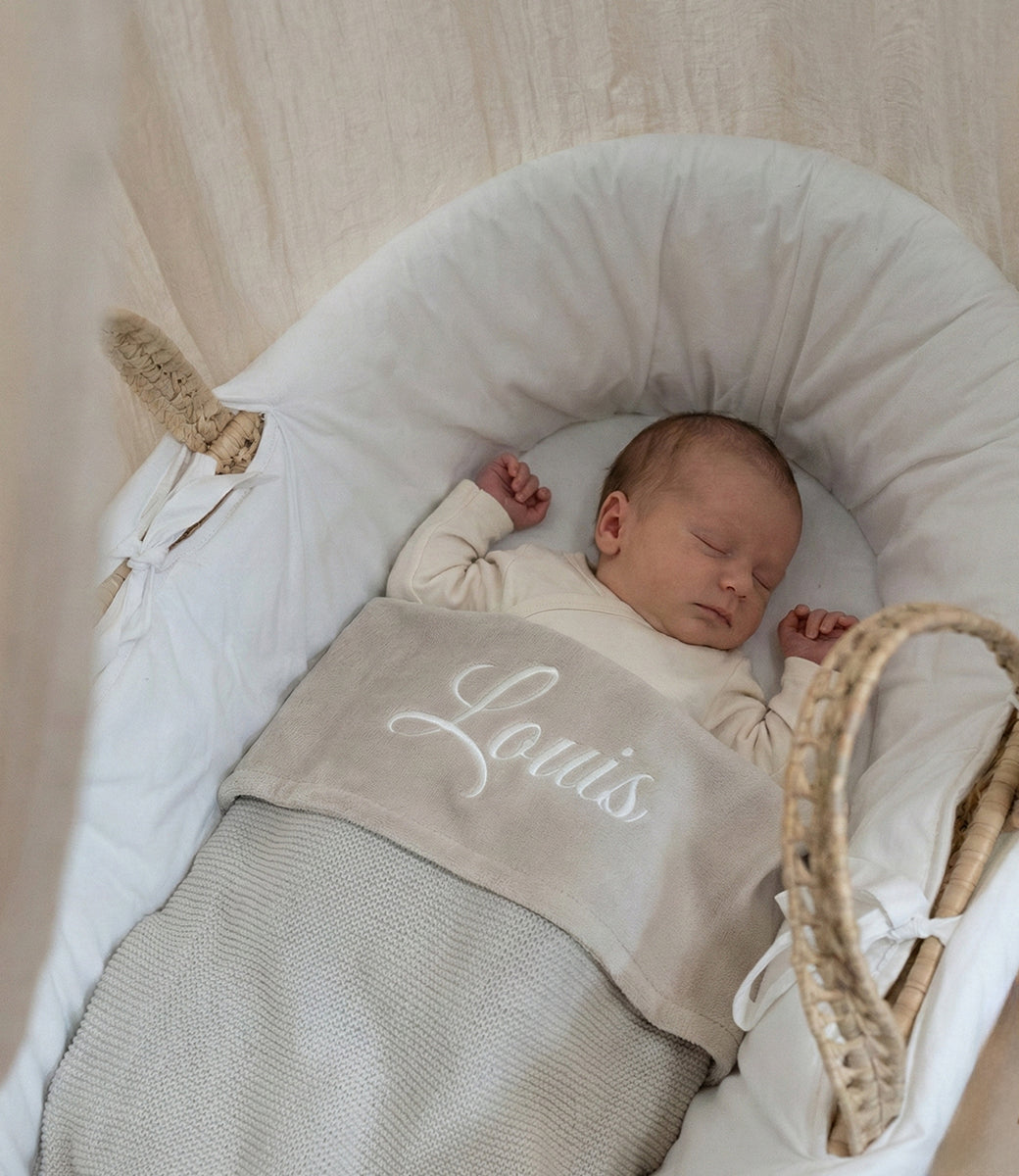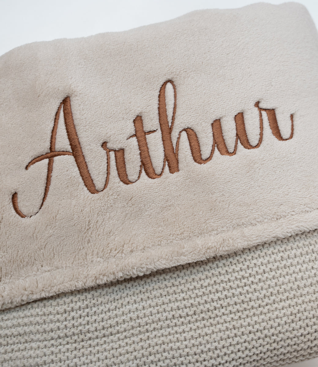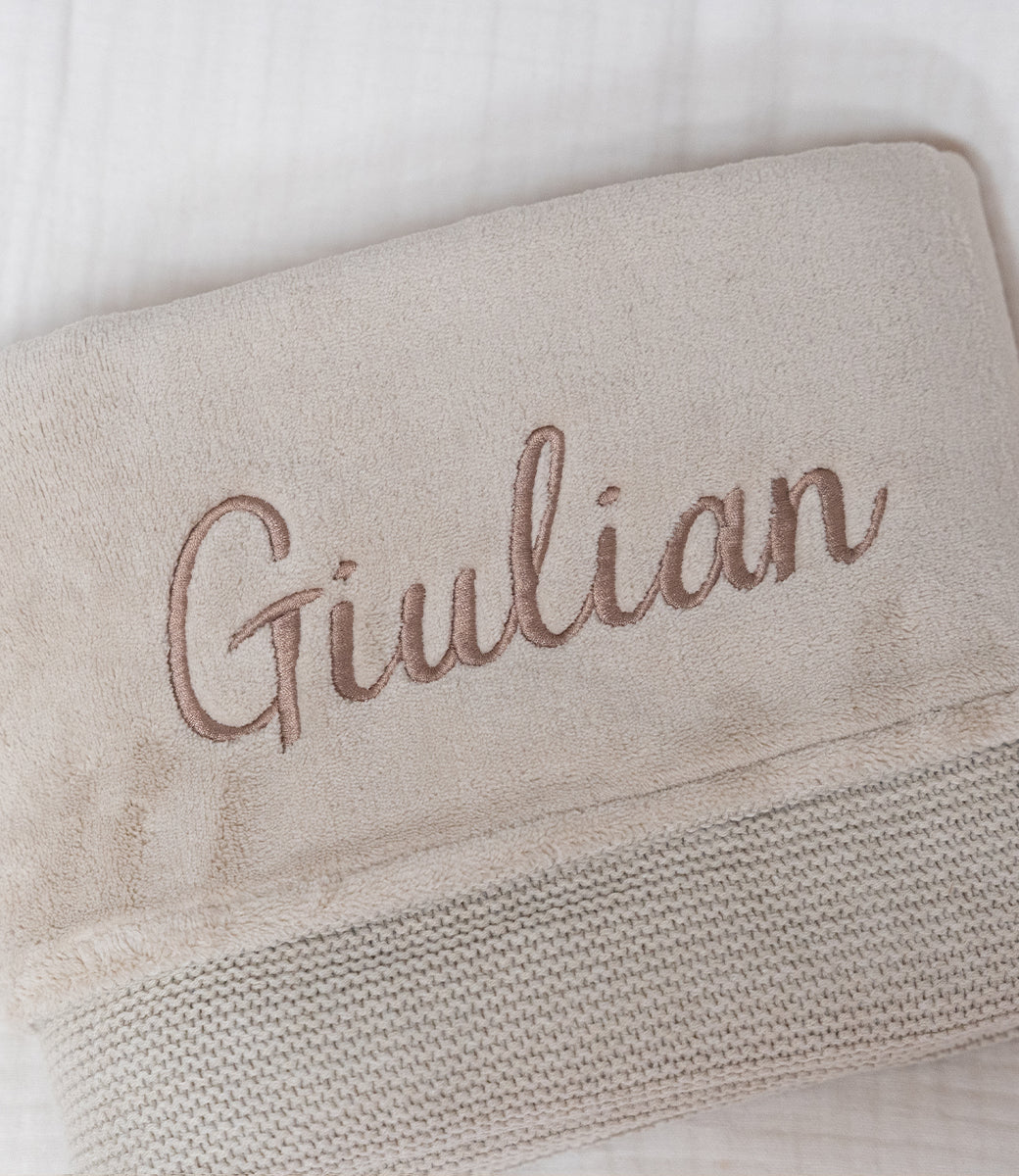 Wil je een borduring in de stijl van je geboortekaartje? Geef je lettertype door en wij werken het dekentje op maat uit.