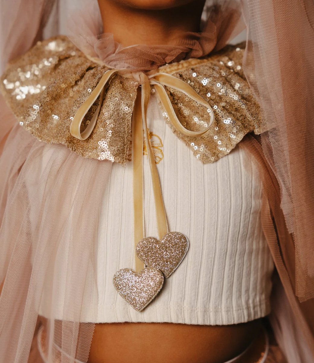 Stap binnen in een wereld vol zachtheid en magie met deze betoverende cape van Mrs. Ertha. De luchtige laagjes tule in warme roze- en taupetinten vloeien prachtig in elkaar over en zorgen voor een sprookjesachtige uitstraling. De gouden paillettenkraag met satijnen strik en hartvormige details maakt het geheel extra feestelijk.