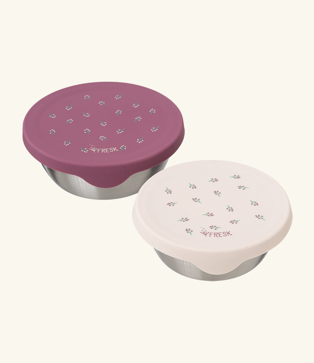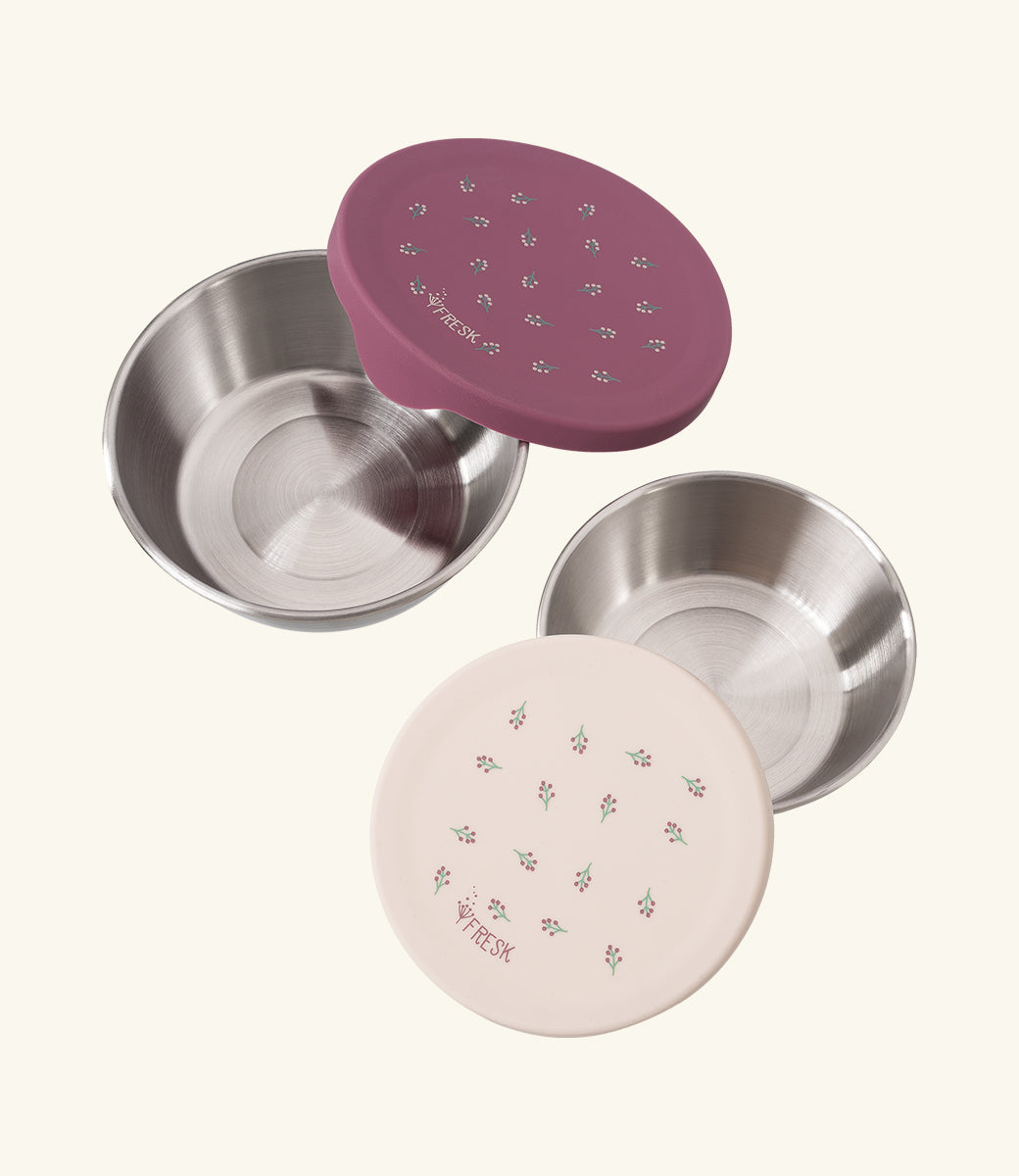 De twee bakjes zijn gemaakt van stevig roestvrij staal en hebben een handige siliconen deksel. De stalen bodem zorgt ervoor dat er geen kleur of geur van de inhoud wordt opgenomen en de flexibele siliconen deksel is gemakkelijk te openen door kleine kinderhandjes.