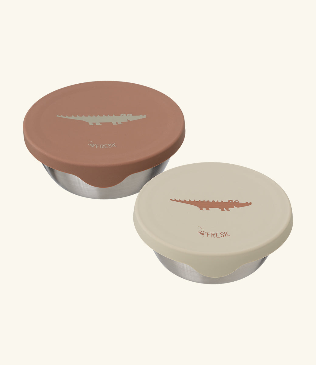 De twee bakjes zijn gemaakt van stevig roestvrij staal en hebben een handige siliconen deksel. De stalen bodem zorgt ervoor dat er geen kleur of geur van de inhoud wordt opgenomen en de flexibele siliconen deksel is gemakkelijk te openen door kleine kinderhandjes.