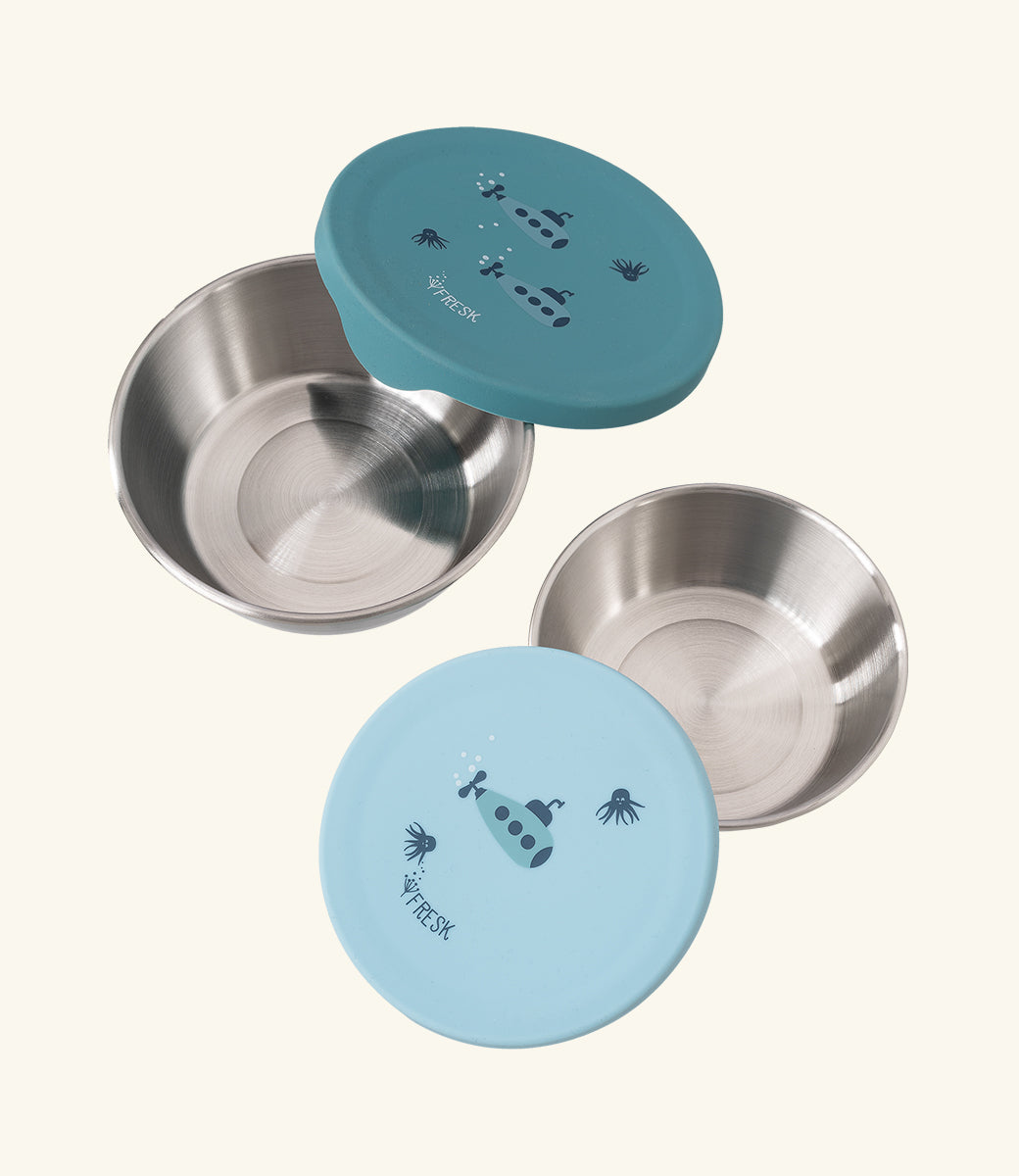 De twee bakjes zijn gemaakt van stevig roestvrij staal en hebben een handige siliconen deksel. De stalen bodem zorgt ervoor dat er geen kleur of geur van de inhoud wordt opgenomen en de flexibele siliconen deksel is gemakkelijk te openen door kleine kinderhandjes.
