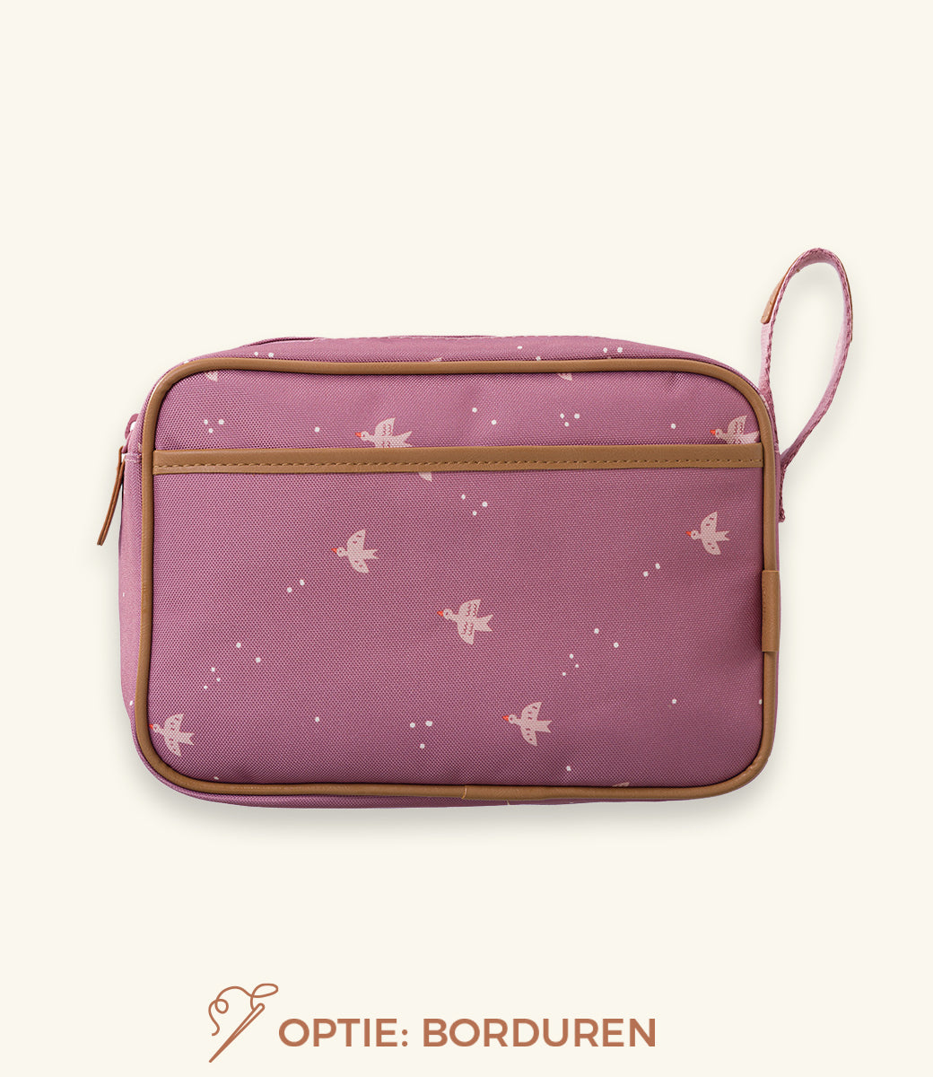 Stevige grote toiletzak met één groot compartiment en één zakje vooraan met magneetsluiting. Ideaal voor op kamp, voor babyspulletjes of zelf als make-up tas.