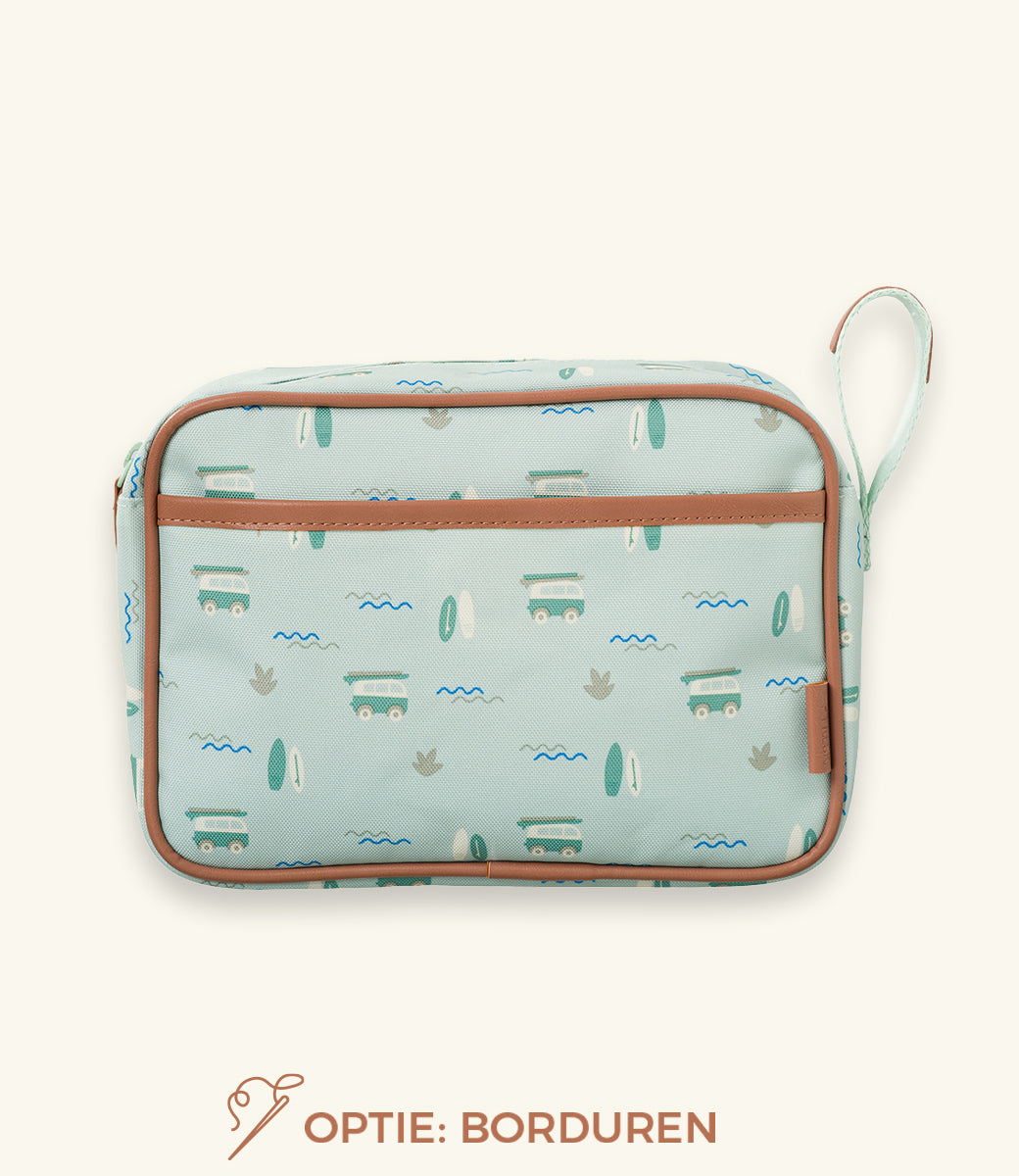 Stevige grote toiletzak met één groot compartiment en één zakje vooraan met magneetsluiting.