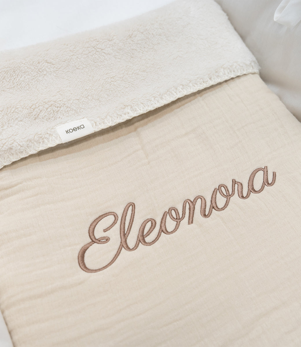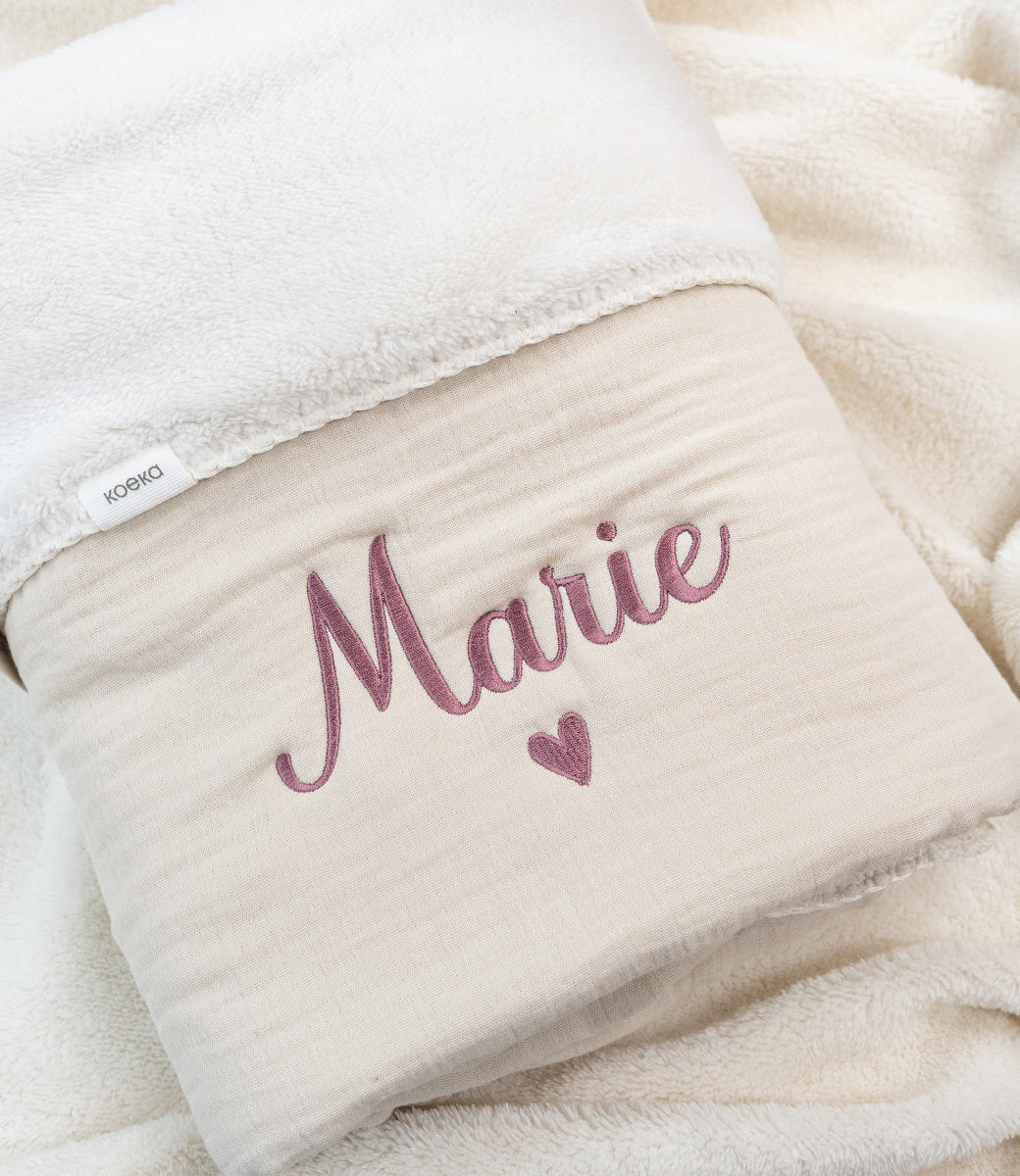 Wil je een borduring in de stijl van je geboortekaartje? Geef je lettertype door en wij werken het dekentje op maat uit.