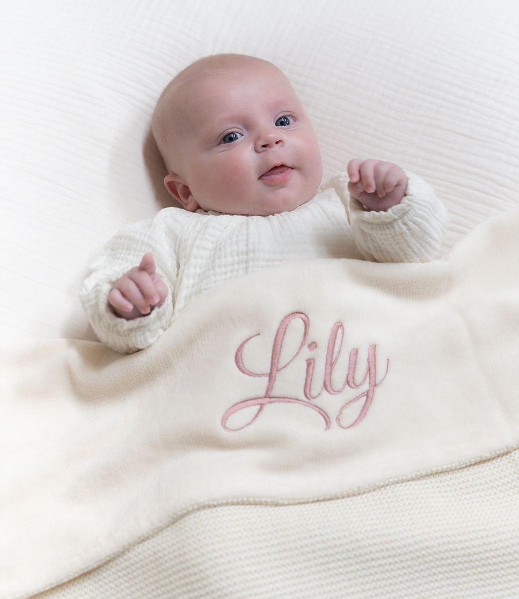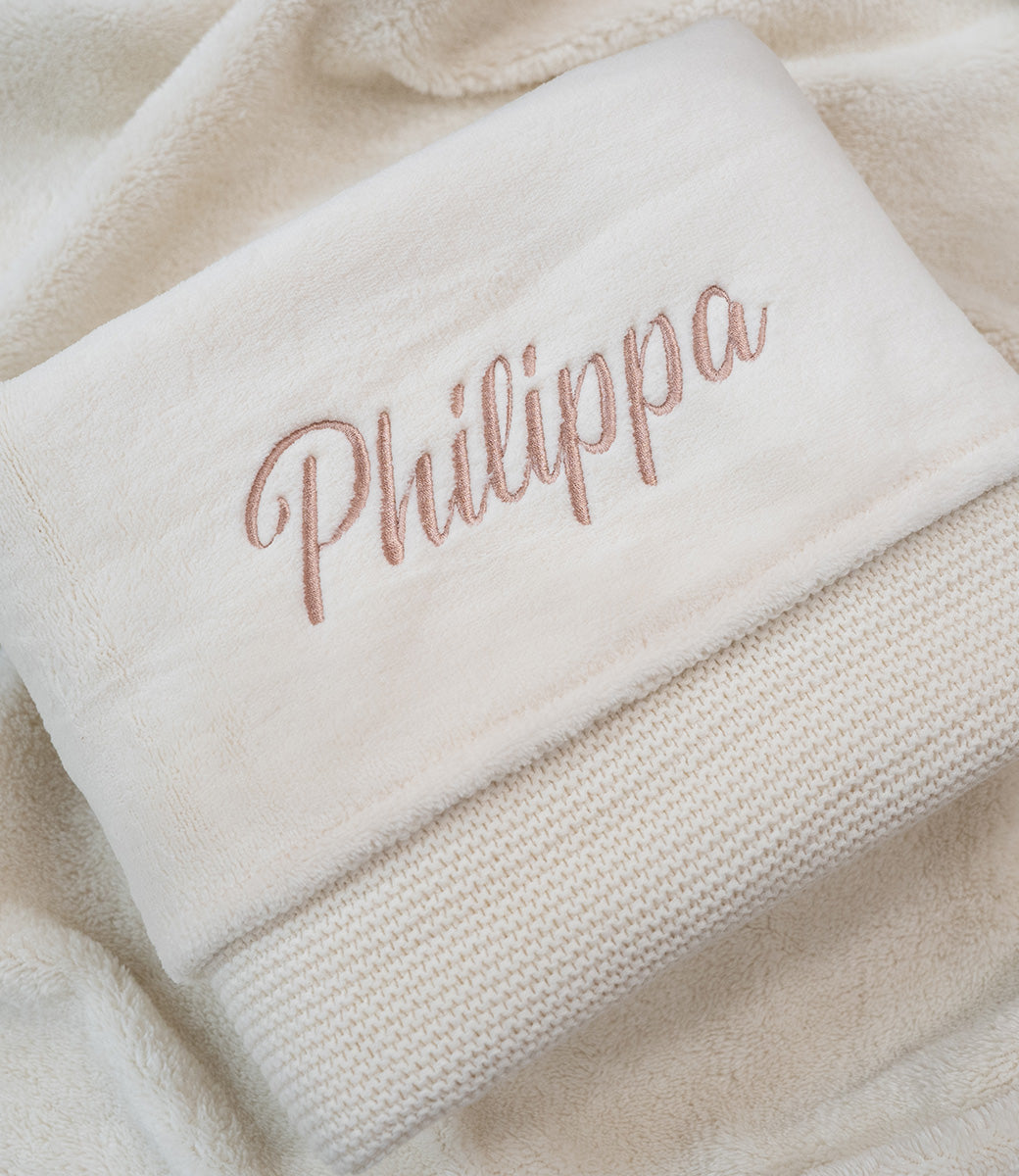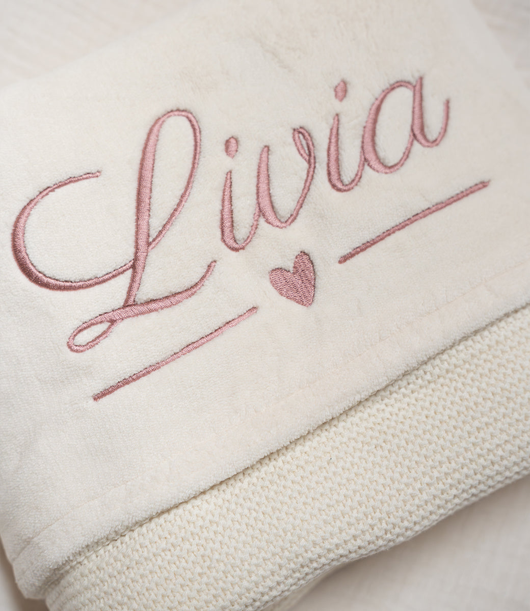Wil je een borduring in de stijl van je geboortekaartje? Geef je lettertype door en wij werken het dekentje op maat uit.